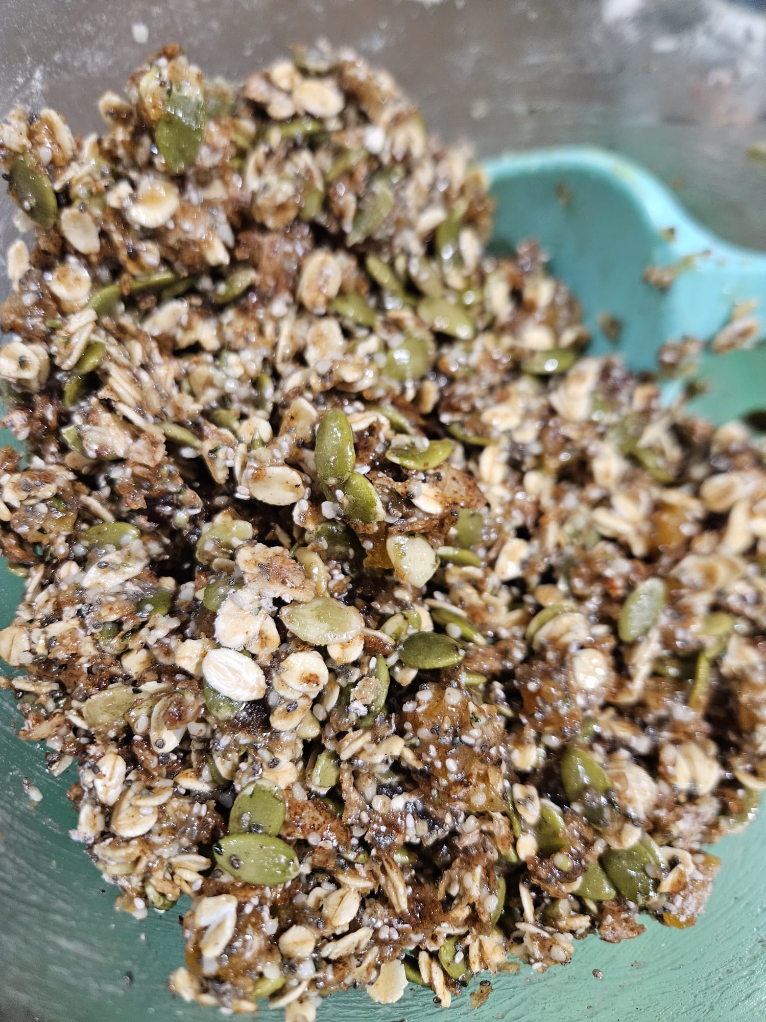 When they start to look a little golden, add in the hemp seeds. As they are so tiny, these cook much faster than the pumpkin seeds. Dry fry them, stirring very frequently, until they are golden brown – it doesn’t take very long!