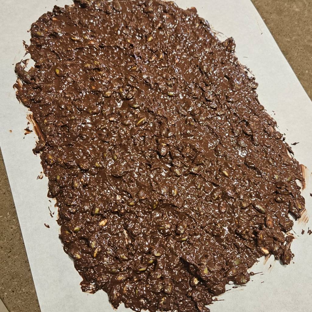 Pour the chocolate mix onto a sheet of baking paper and spread it out as thin as you are able.