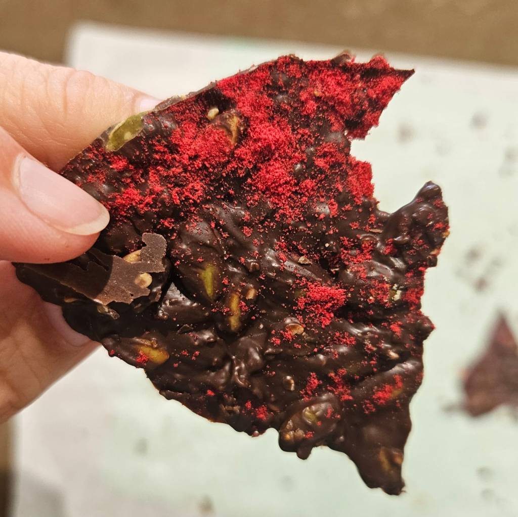 Before the chocolate sets, sprinkle over the raspberry powder.