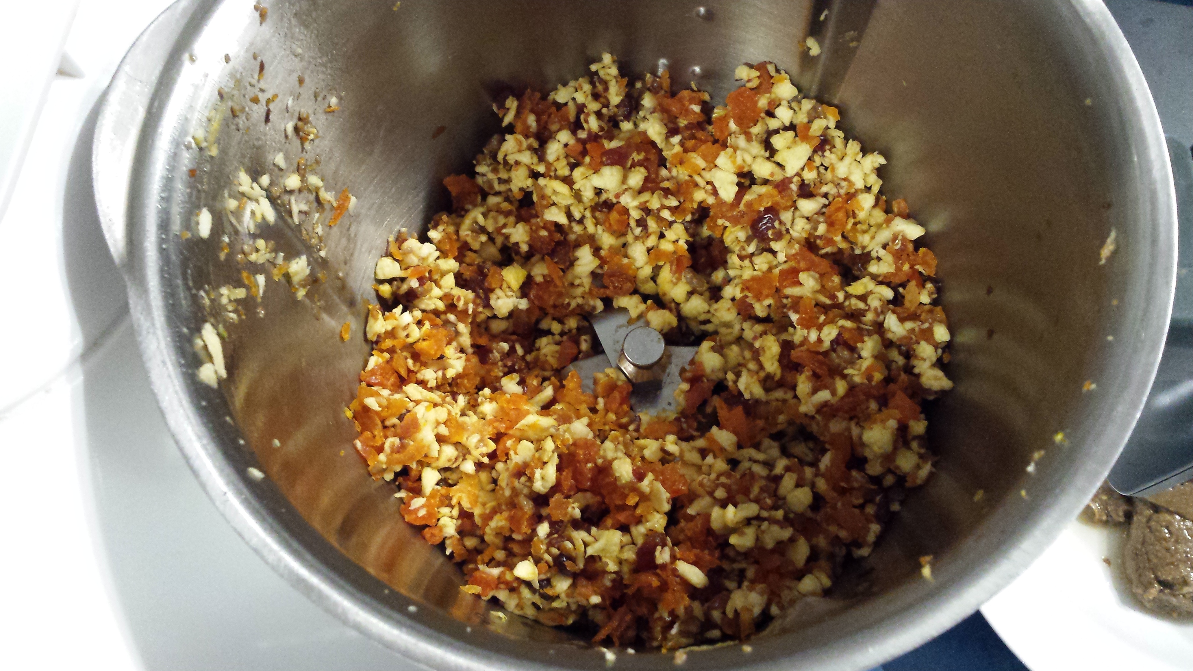 In a food processor blitz together the apple and apricots (speed 8 for about 15 seconds in a thermal cooker), then add the dates one at a time through the chute at the top (speed 4 while you are adding then up to 7 for 15 seconds).