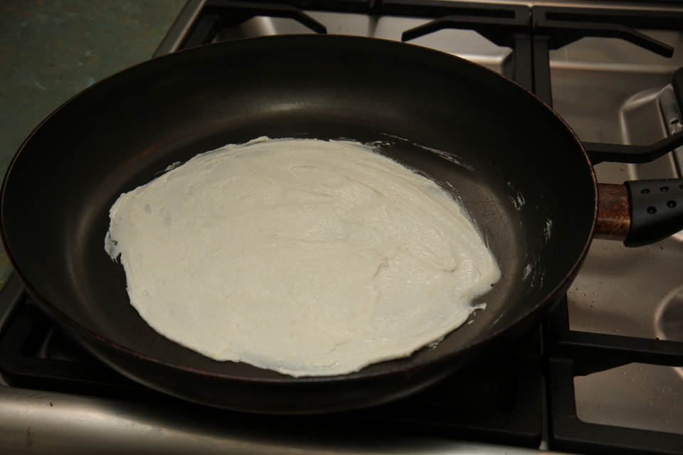 Add a heaped wooden spoon full of mixture to a cold frying pan then use a spatula to spread it out so that there is a thin layer covering the base of the pan. Don’t grease the pan – the oil in the batter is sufficient.