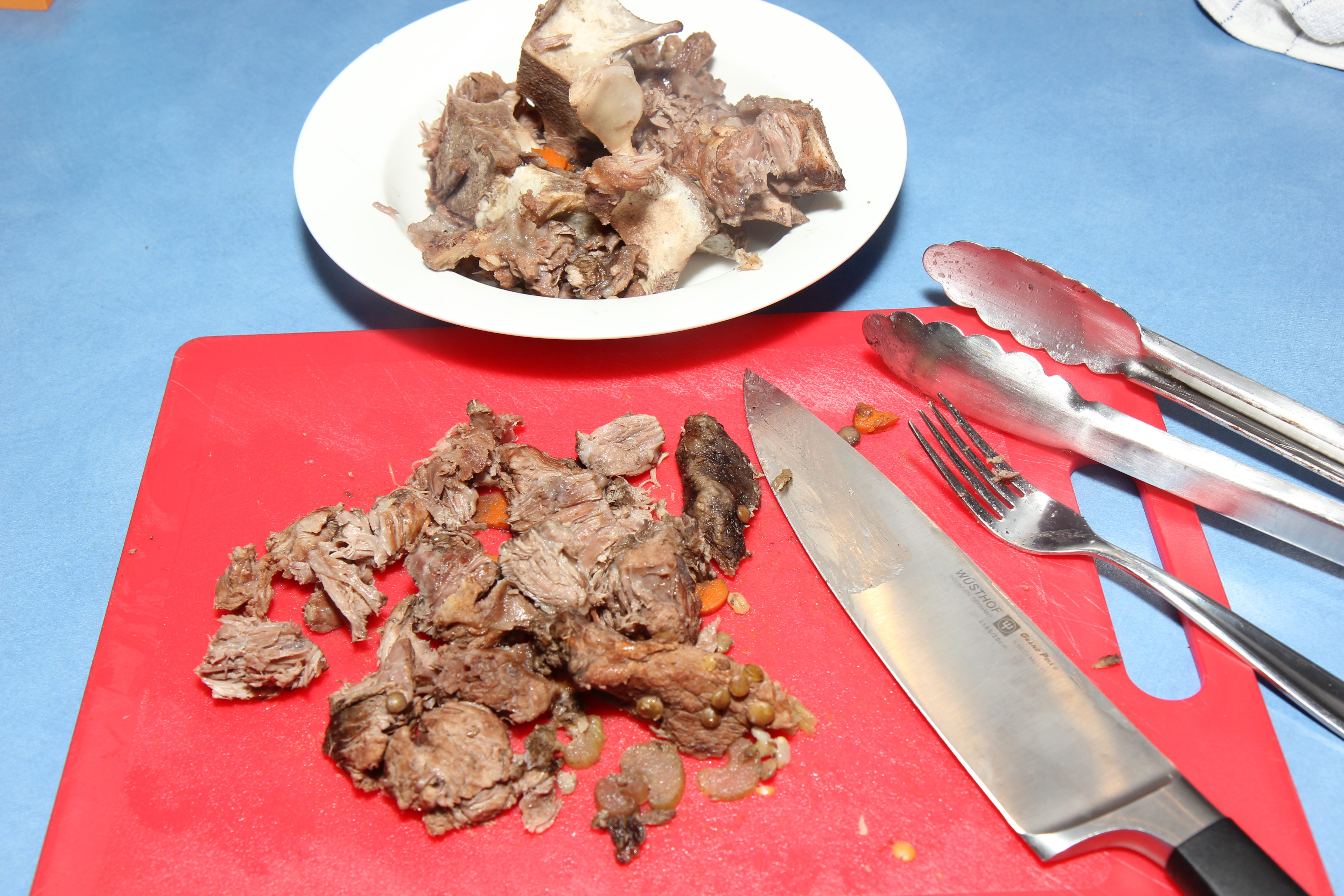 Remove beef bones and strip the meat. Remove sprigs of thyme. Dice the meat up and return to the pot, stirring well. Add salt to taste.