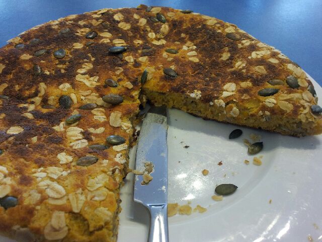 Add the flour, salt and seed mix to the pumpkin mix and fold together. Start with 3/4 of the flour and gradually add a bit more if the mix is too wet.