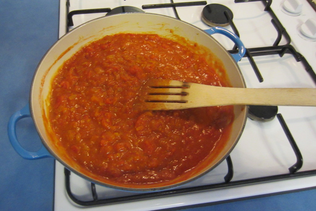 Add the tomatoes to the pan and stir until well combined with the spices. Add sugar and stir.
