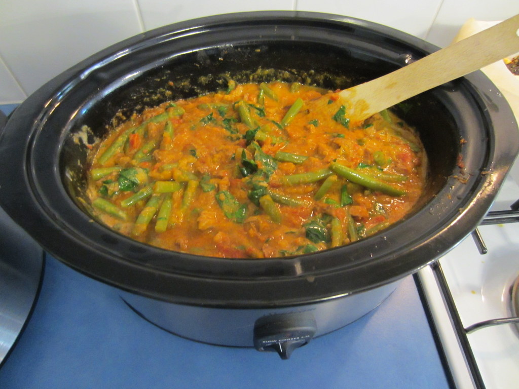 Remove the bones from the slow cooker and strip the meat. Dice the meat and return it to the slow cooker along with the green beans and stir well. Discard the remainder of the bones.