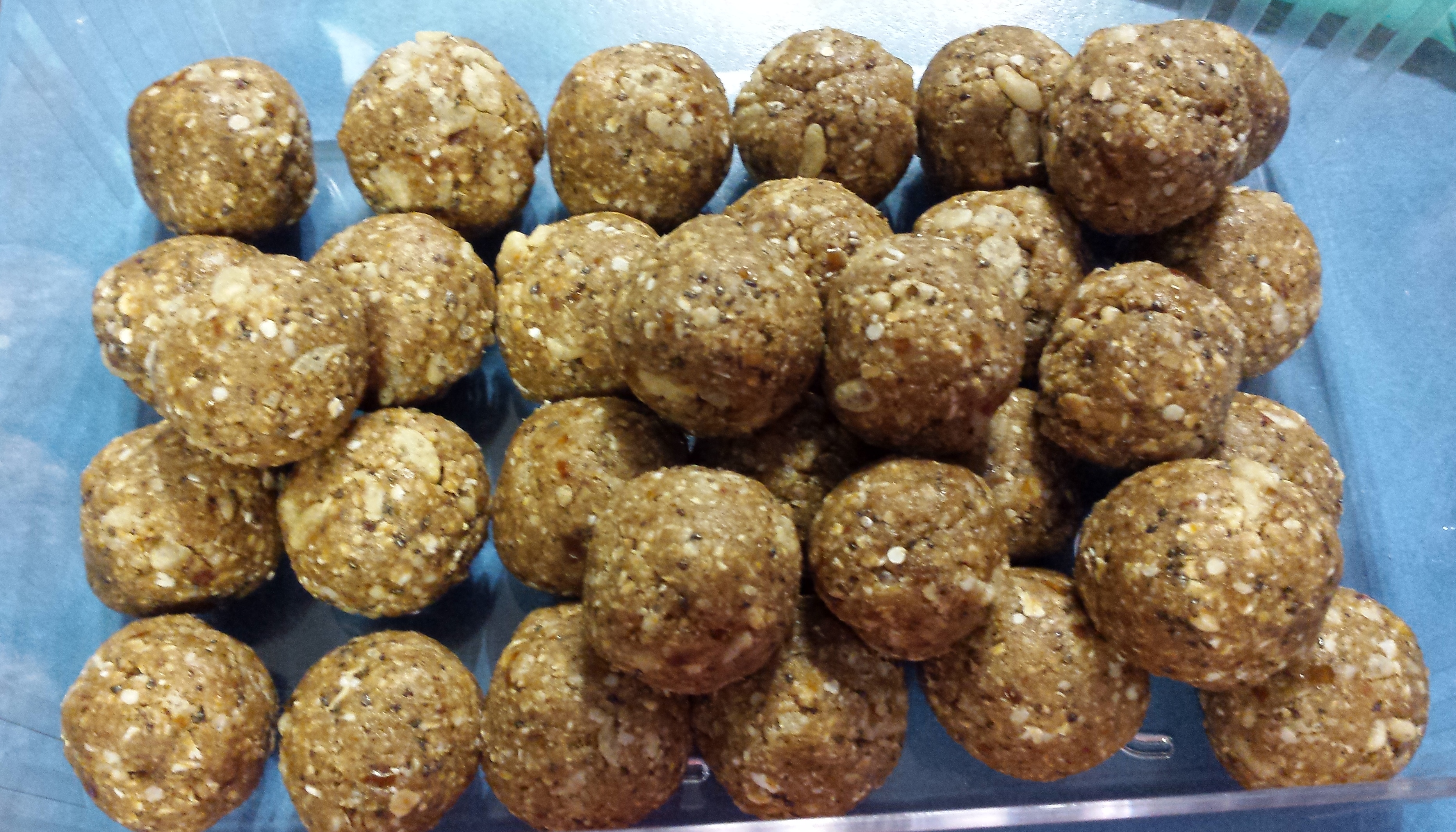 Roll a teaspoonful of the mixture into a ball and store in airtight container in the fridge .
