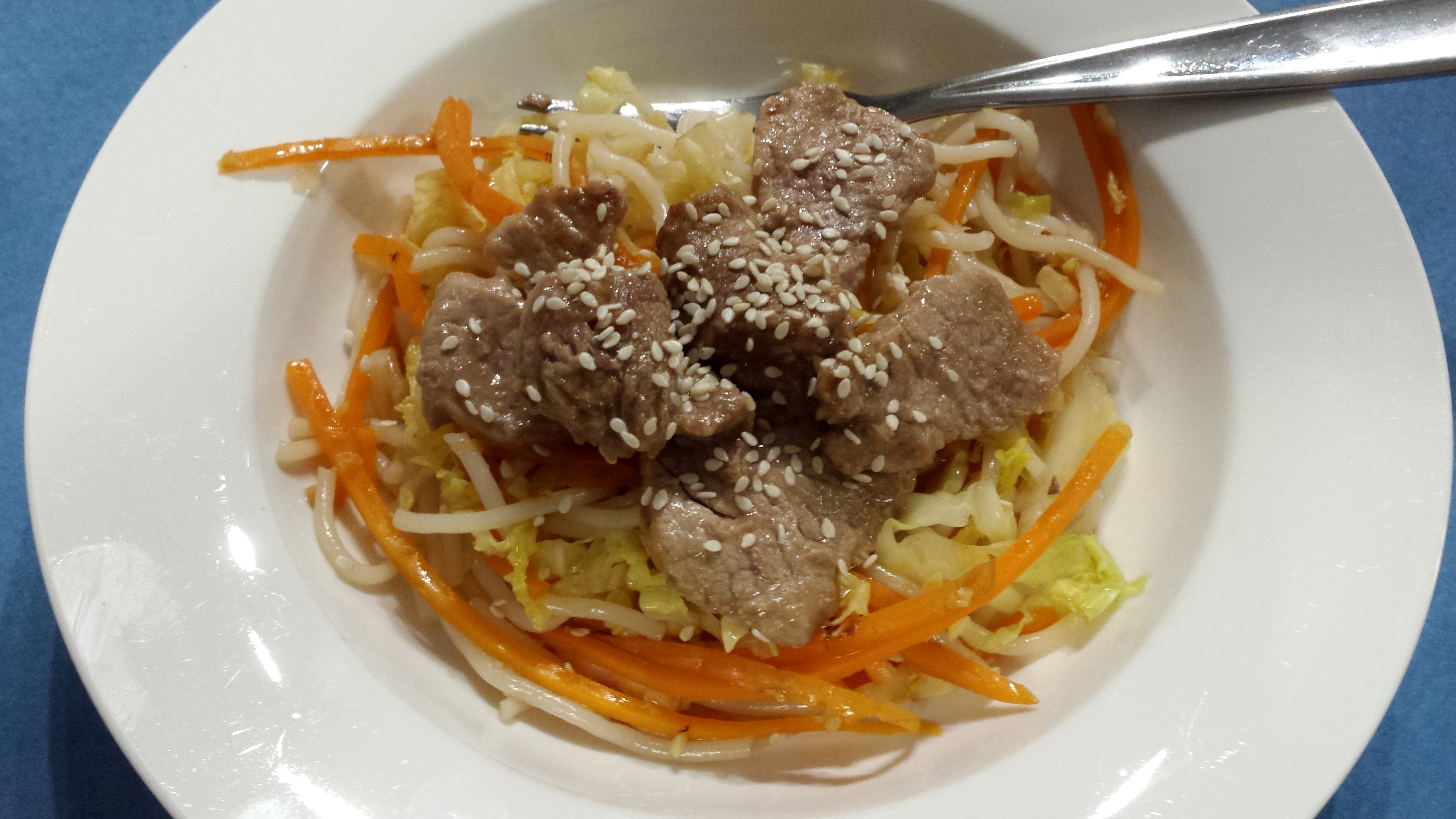 Serve the noodles then top with pork (and some sesame seeds if your diet allows).