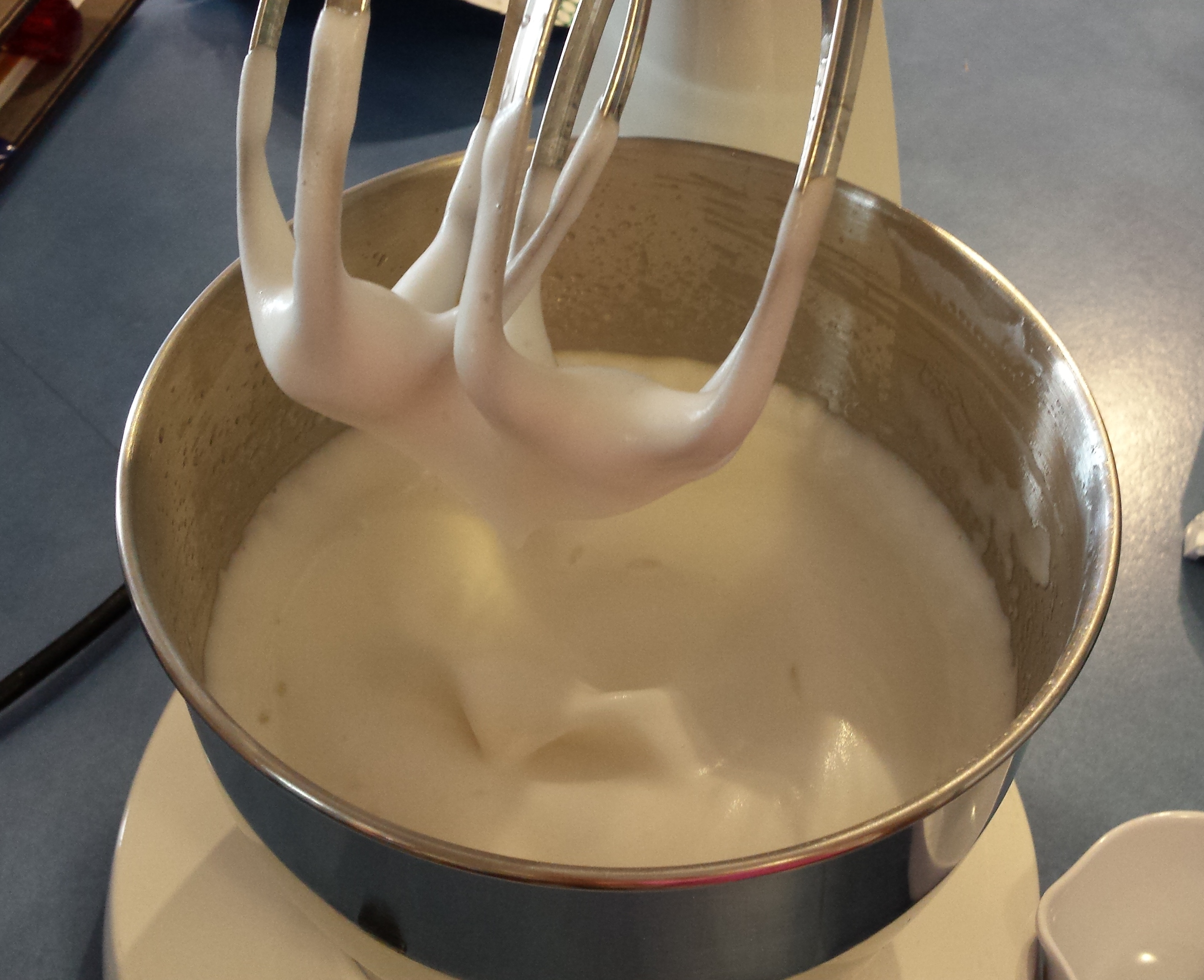 Place the liquid in a very clean bowl of your stand mixer and turn on to a high speed (Mine is a Sunbeam Mixmaster and goes up to 12 and I used speed 10).