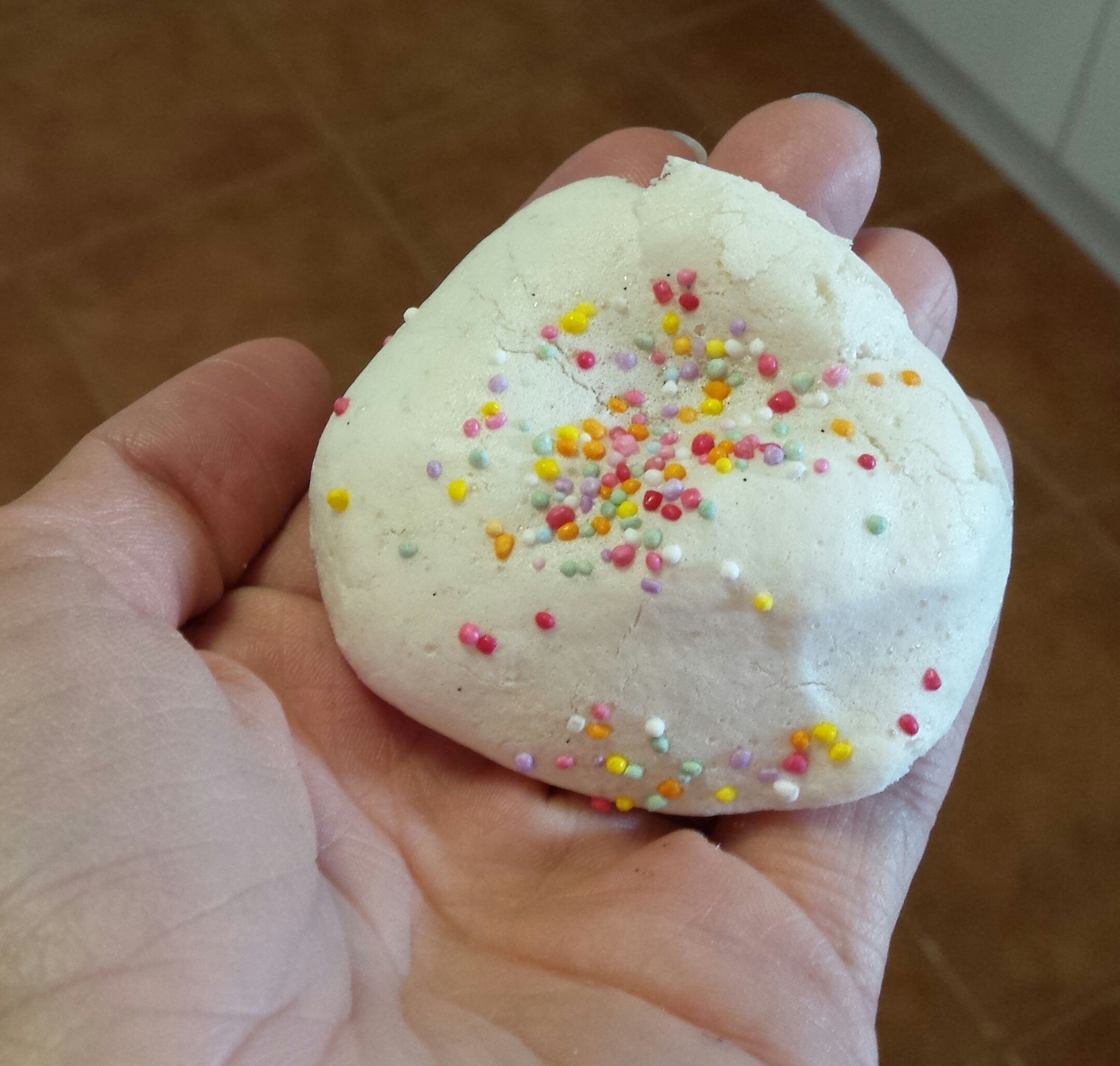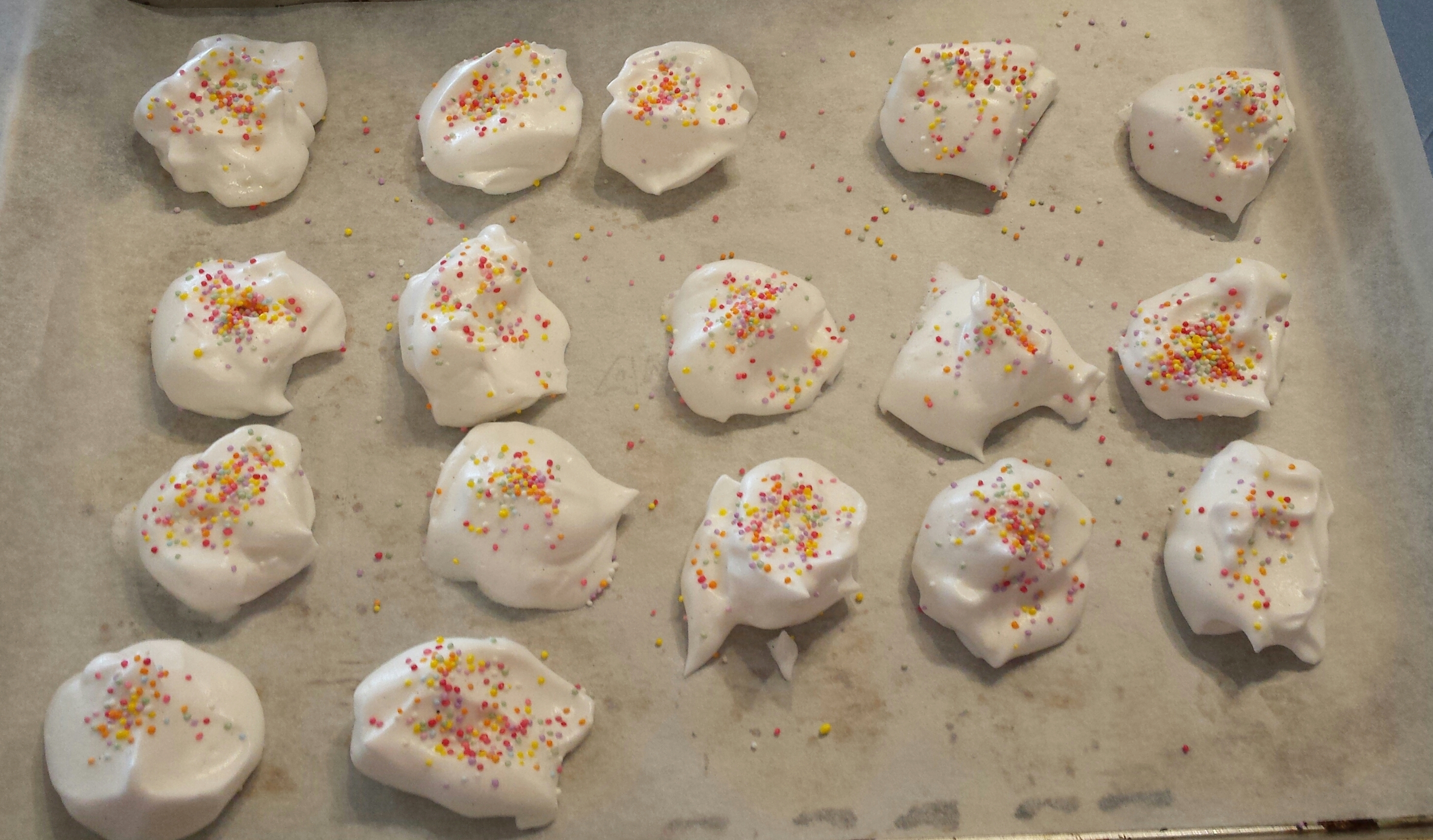 Spoon on to a lined baking tray (and add sprinkles if you wish) and place in a preheated 100C oven to bake for about 1.5 hours.