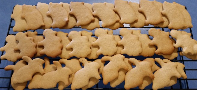 Use a shaped cutter to cut our your desired shapes (today we went with farm animals) and lay on a lined baking tray.