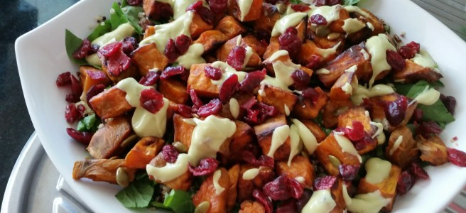 For a delicious variation on this dish we use pumpkin in place of potato, pomegranate seeds in place of cranberries and slivered almonds in place of pepitas.